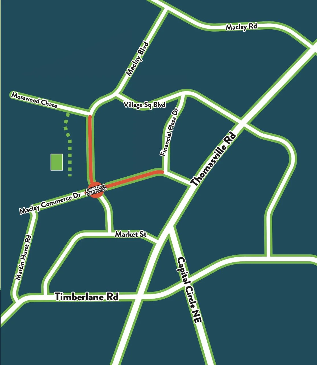 Effect 3/2/26: Maclay Commerce Drive east of the intersection will close from Maclay Boulevard to Financial Plaza Drive.